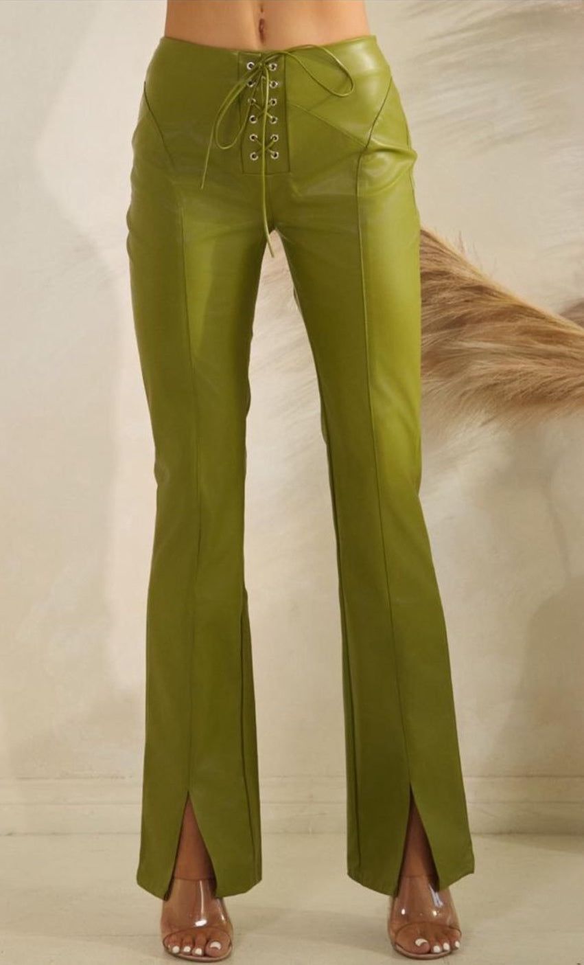 Fashion forward piece made from a rich faux leather material. They feature a high-rise waist with lace-up front detailing that adds a sultry, corset-inspired touch. The fitted silhouette flares slightly toward the hem, which is...