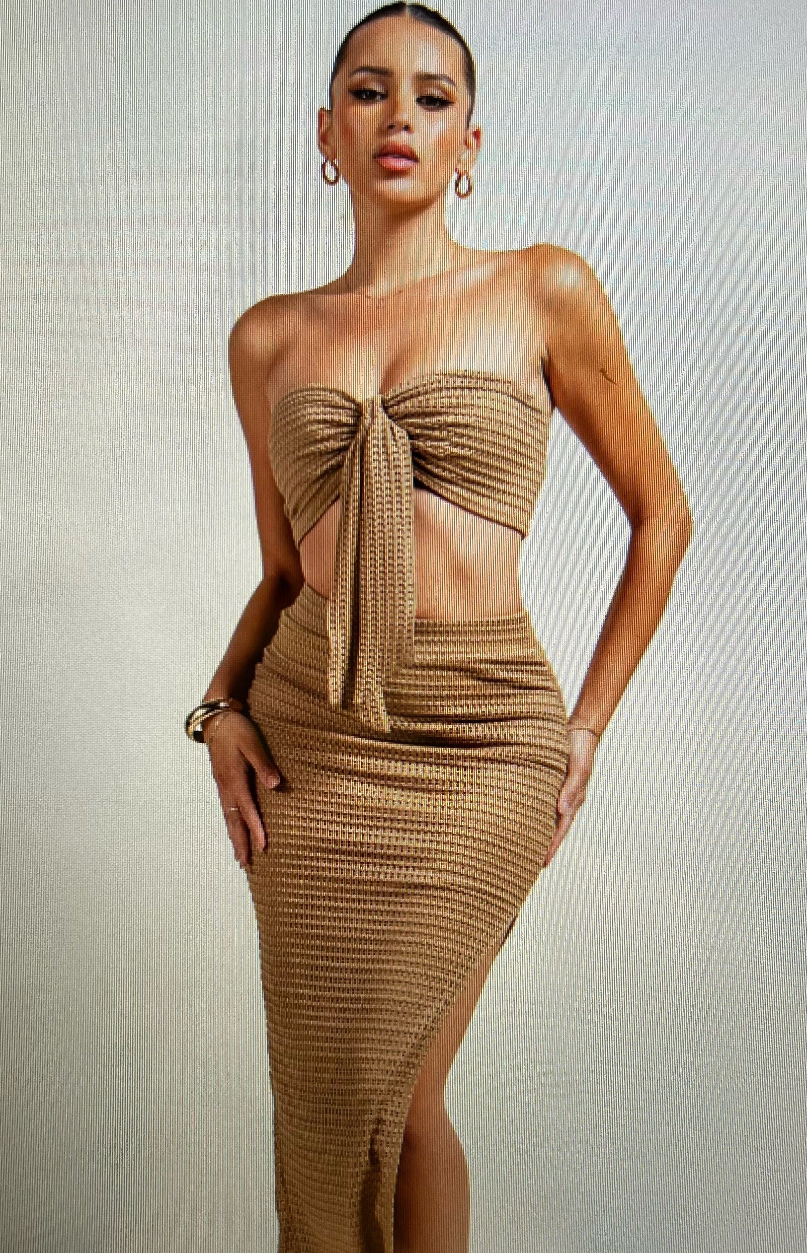 This outfit features a chic  two piece crochet style set. The strapless bandeau top ties at the front with an elongated knot, creating a playful yet sultry keyhole effect. The matching high-waisted skirt hugs the...