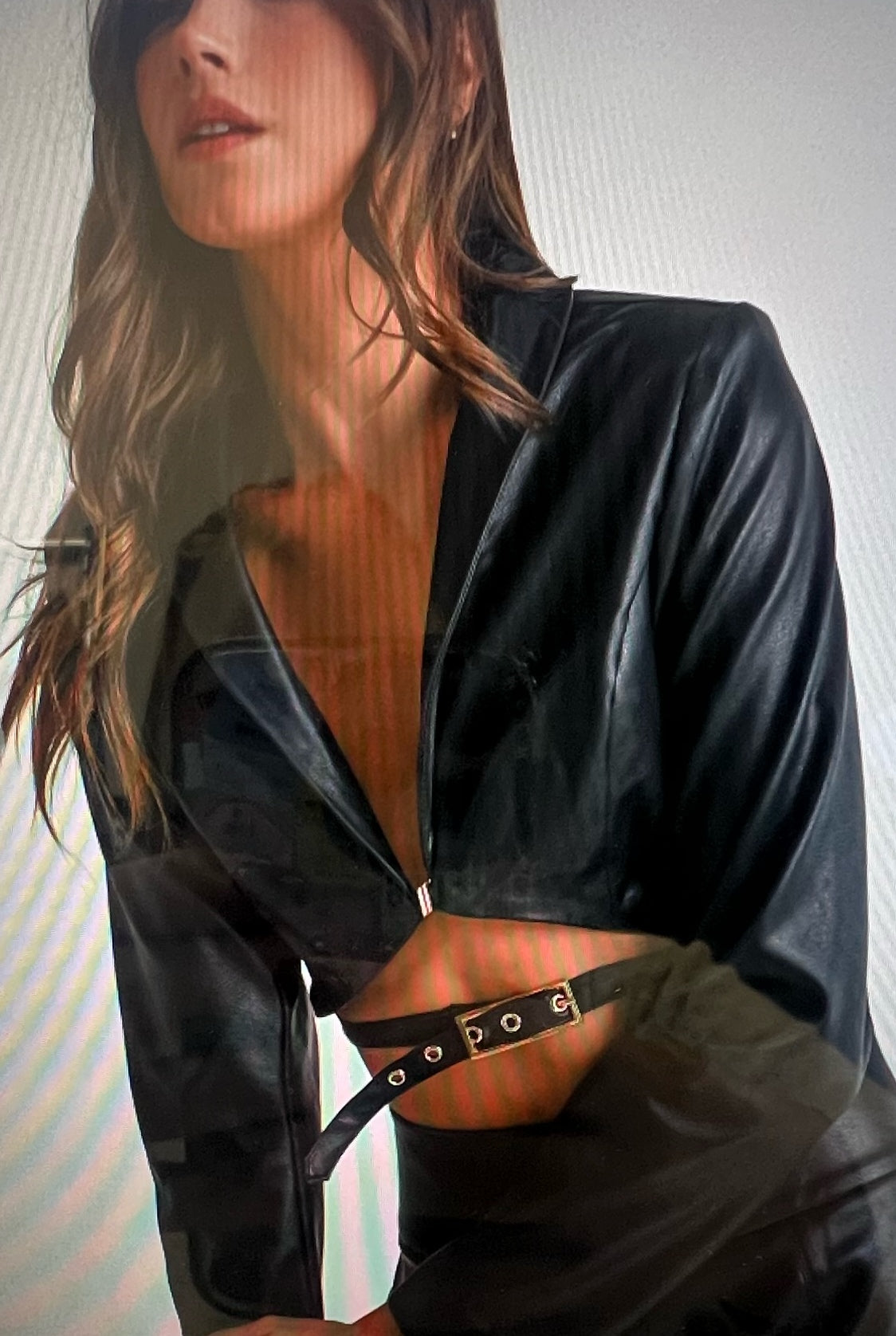 Black faux leather cropped jacket with a modern, edgy design.  Cropped cut: The jacket ends above the waist, revealing part of the midriff for a bold and contemporary look. Zip front closure: A centered zipper...