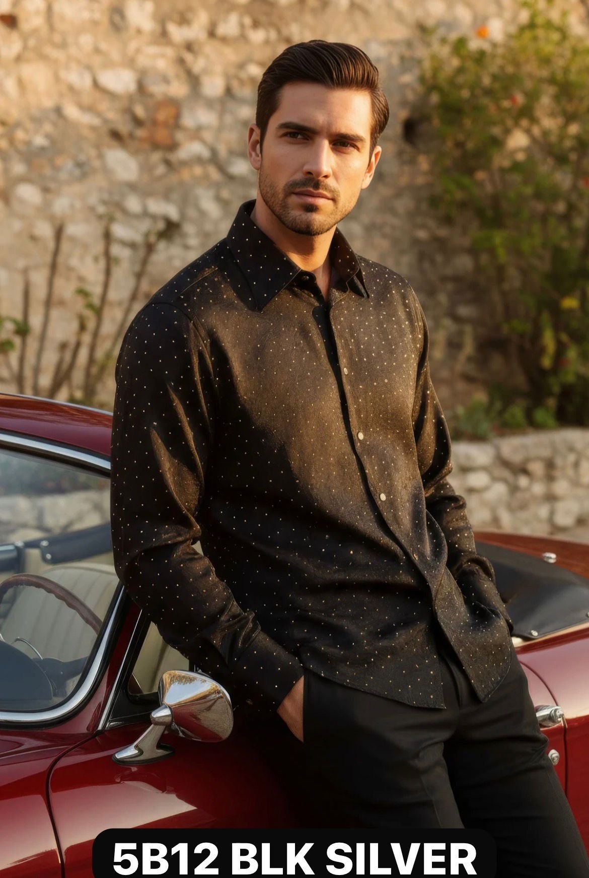 The shirt long sleeve dress shirt made from a slightly glossy, textured fabric. It has a subtle silver dotted pattern evenly spread across the material, adding a touch of sophistication. The shirt features a classic...