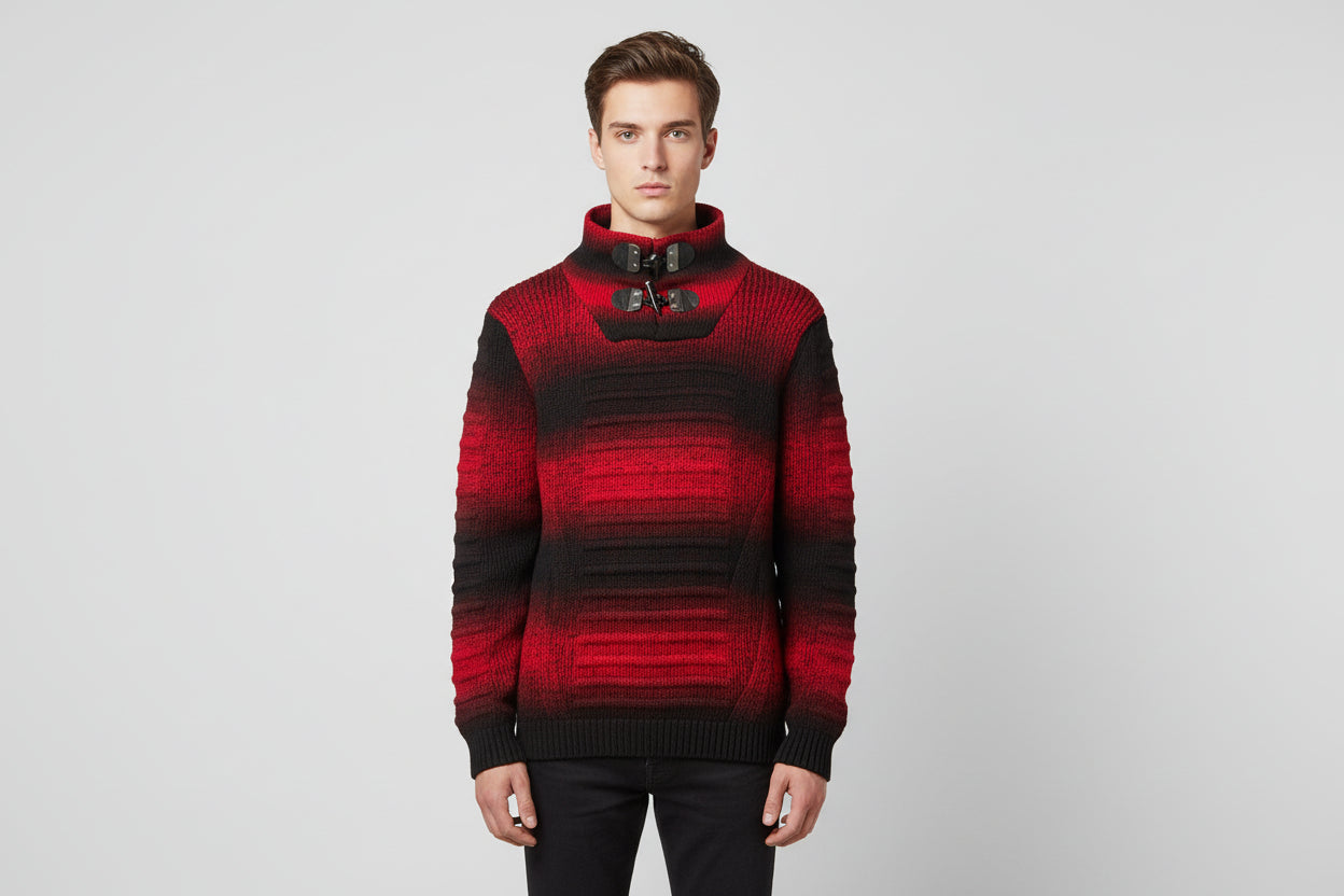 This deep black and red knit sweater features a rich textured weave with subtle cable accents along the shoulders and sleeves. Designed with a high funnel neckline, it fastens with distinctive toggle closures at the...