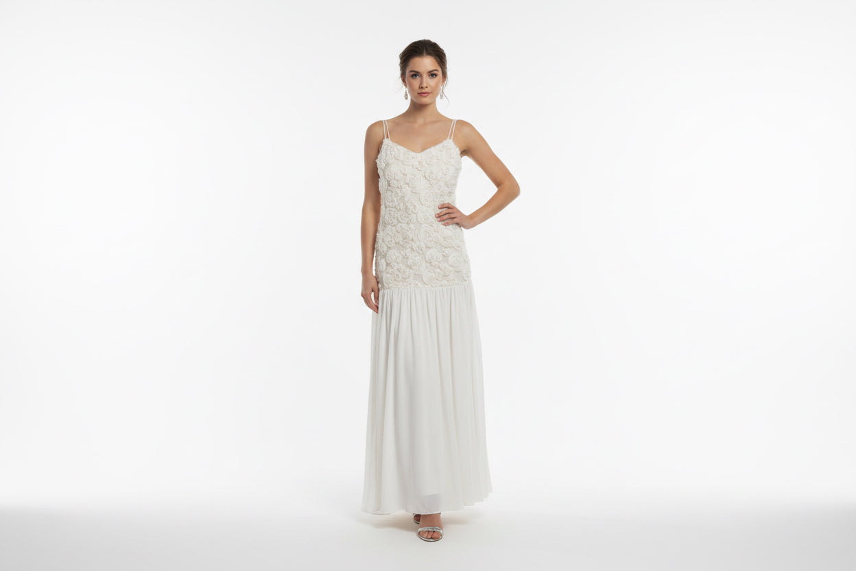This dress is a romantic ivory piece featuring delicate spaghetti straps and a fitted bodice adorned with intricate 3D rosette appliqués that give it a beautifully textured, floral look. The fabric shimmers subtly beneath the...