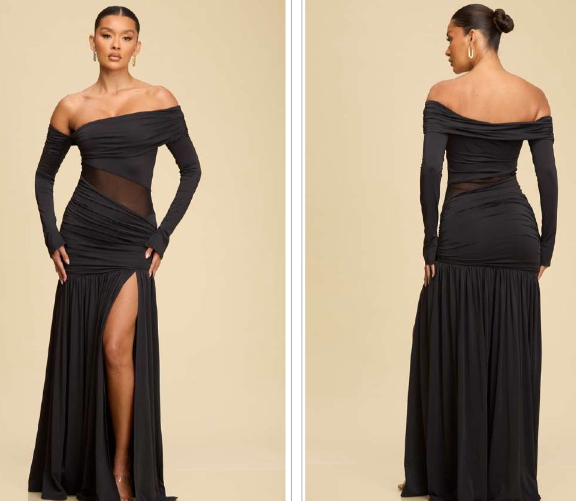 Black off-the-shoulder gown with long sleeves, mesh waist cutout, ruched design, and a high side slit for a sleek, sexy finish.