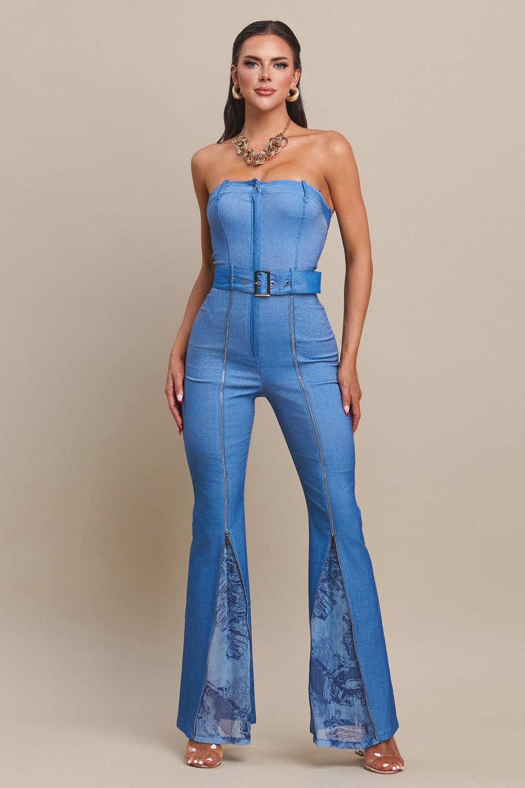Turn heads with this stunning stretch denim tube top jumpsuit, designed to hug your curves in all the right places. Featuring a strapless neckline, bold zipper detailing, and a belted waist to accentuate your silhouette,...