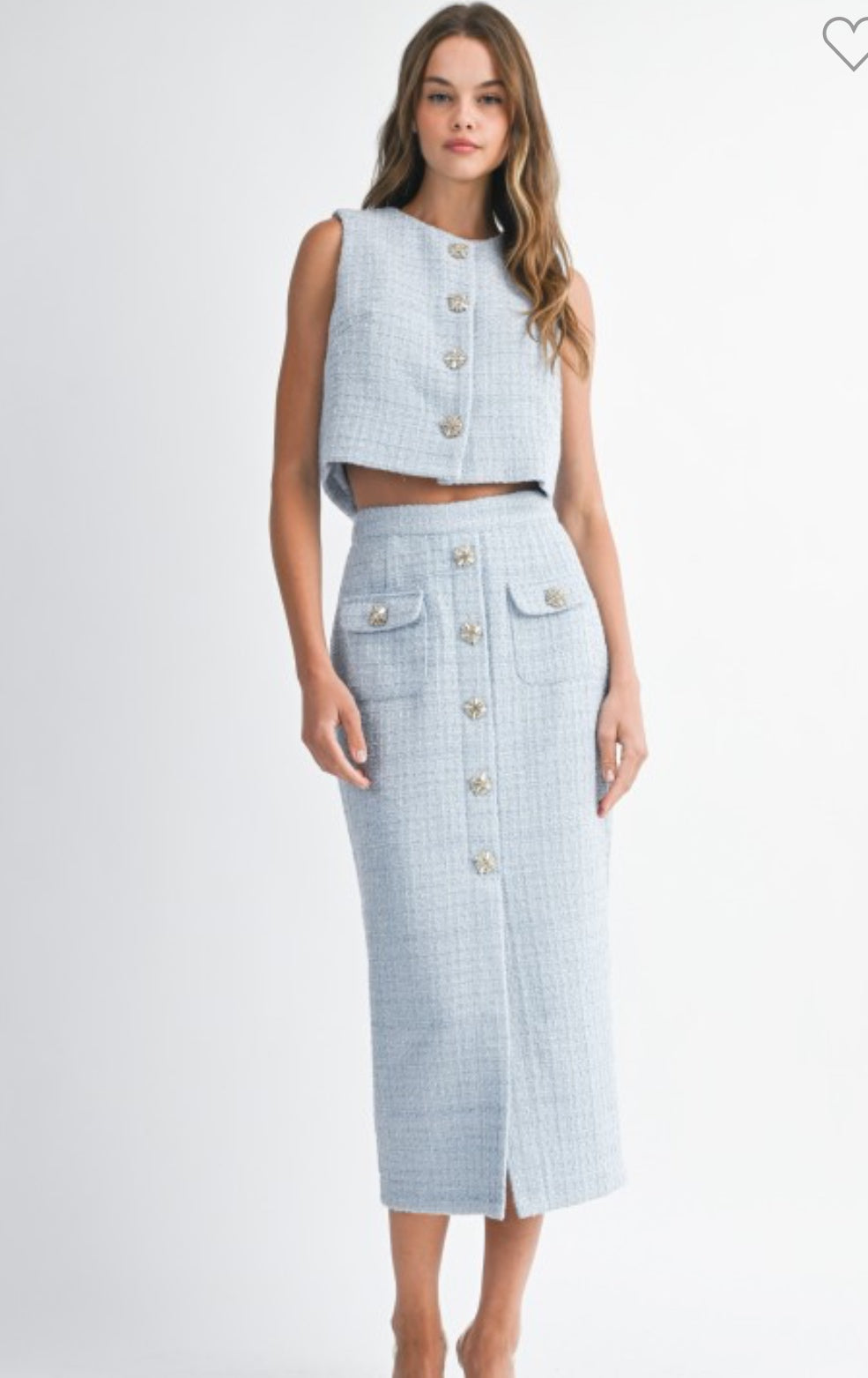 This set features a light blue sleeveless tweed crop top with statement buttons paired with a matching high-waisted midi skirt, creating a polished and elegant look.