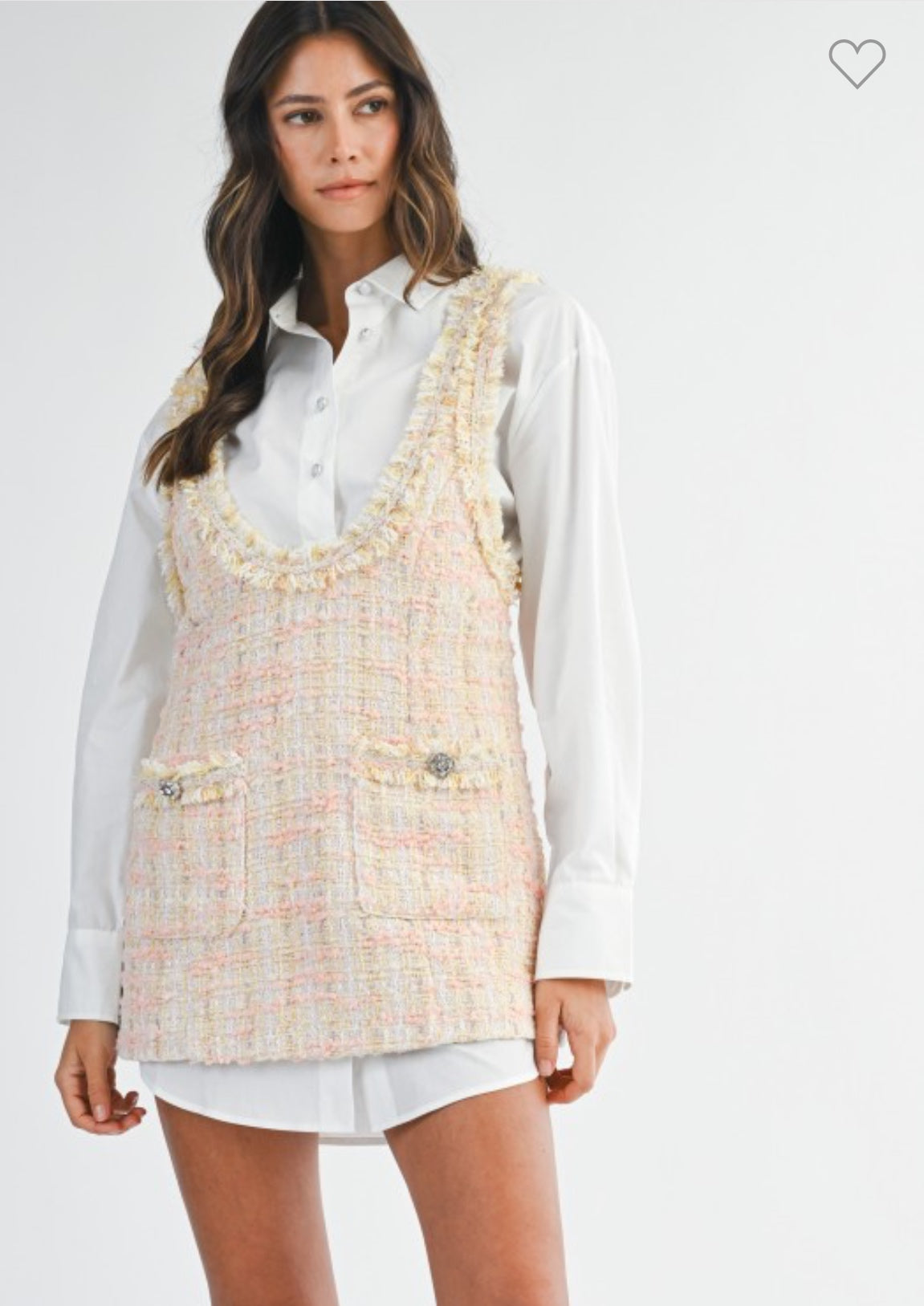 This set features a chic layered look combining a crisp white button-down shirt dress with a sleeveless tweed tunic vest.