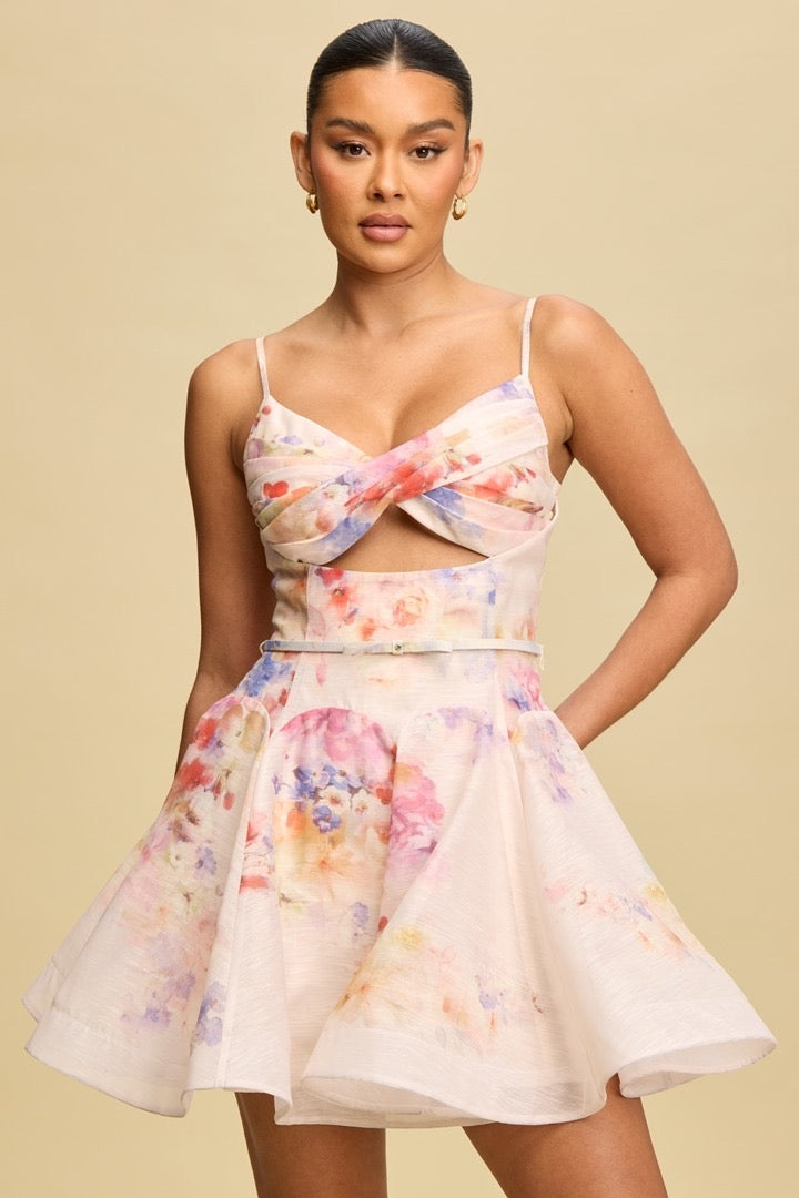 Romantic and feminine design with a watercolor floral print in soft pastel shades of pink, purple, and peach. The bodice has thin spaghetti straps and a unique twisted front detail with a keyhole cutout under...