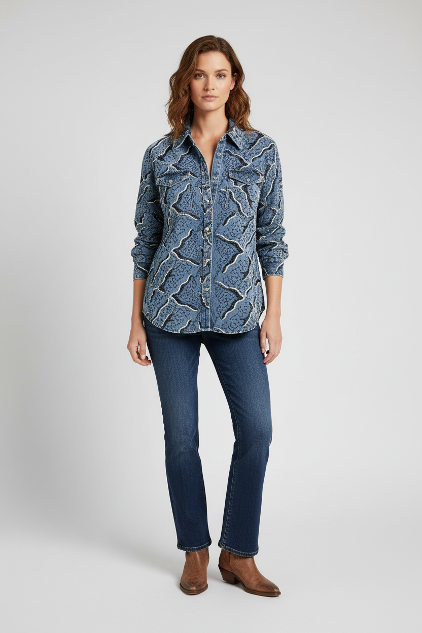 A dazzling denim corset-style crop top adorned with a mix of metallic studs, reflective crystals, and intricate beadwork, creating a bold, statement-making design. The structured cups and contouring seams enhance the silhouette, while the sleek...