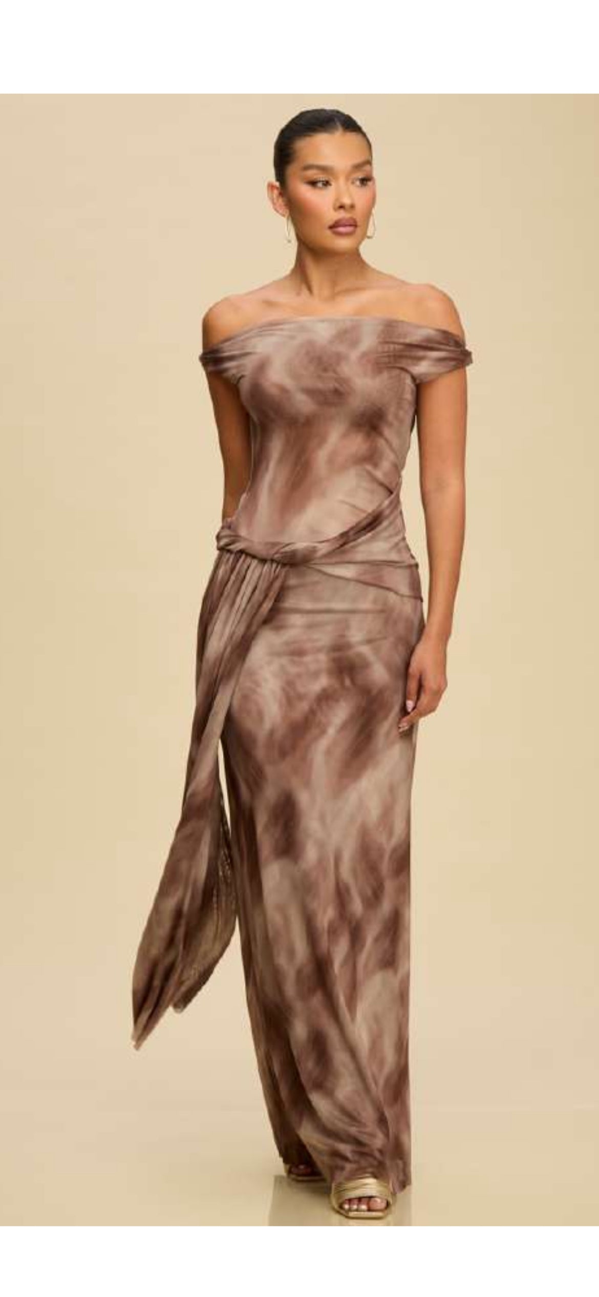 The dress is an elegant, floor length gown made from a soft, fluid fabric that drapes closely over the body. It features an offt he shoulder neckline that gently folds over the upper arms, creating...