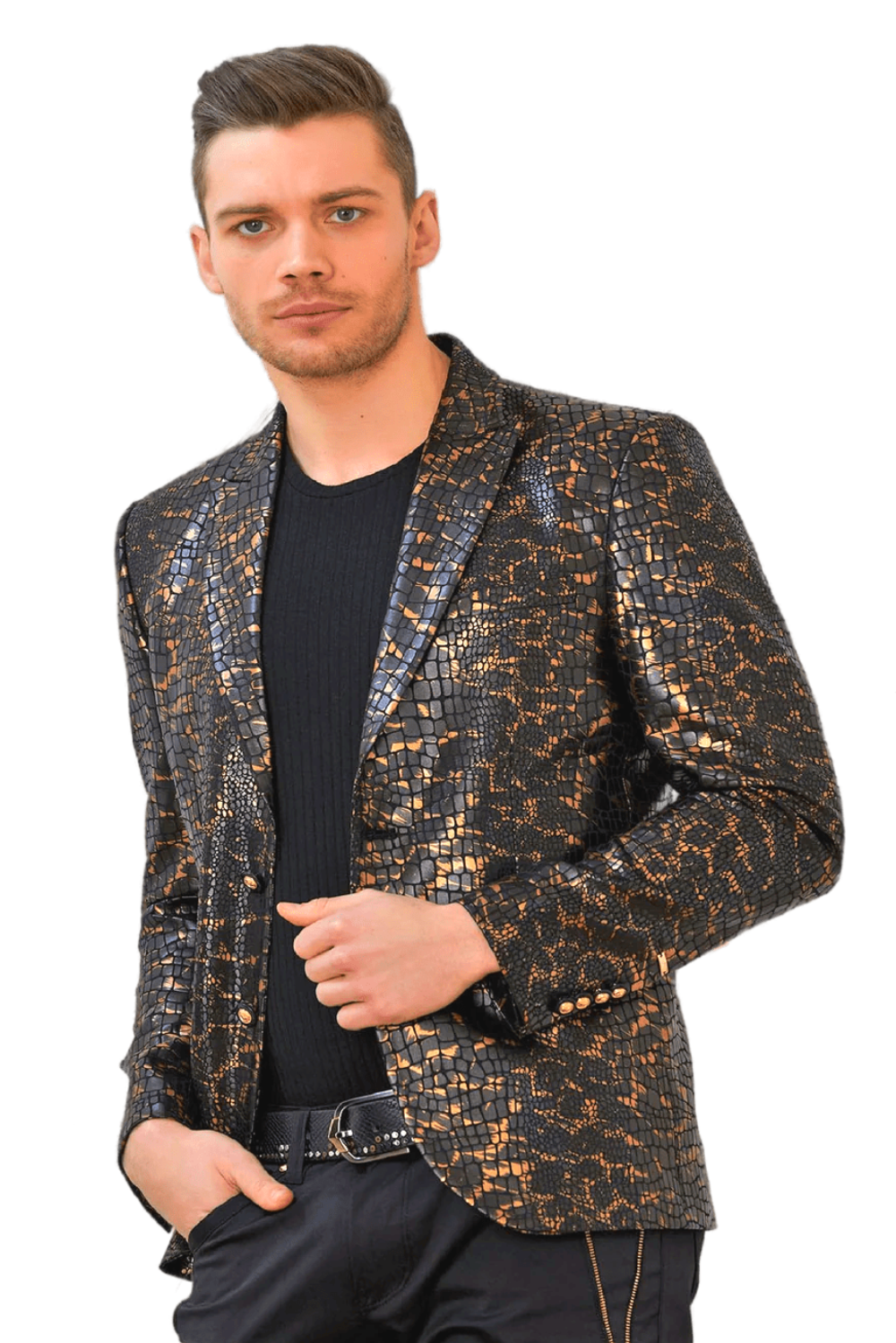 Looking to make a statement at your next night out? Our brown and black alligator skin suit will do just that. The striking pattern and unique color combination make this suit a show-stopper, guaranteed to turn heads. The luxurious feel of the alligator skin material and tailored fit of the suit create a look that's both comfortable and stylish. Perfect for any night life event, this suit will help you stand out from the crowd and leave a lasting impression. Find your perfect brown and black alligator skin suit and make your next night out one to remember!