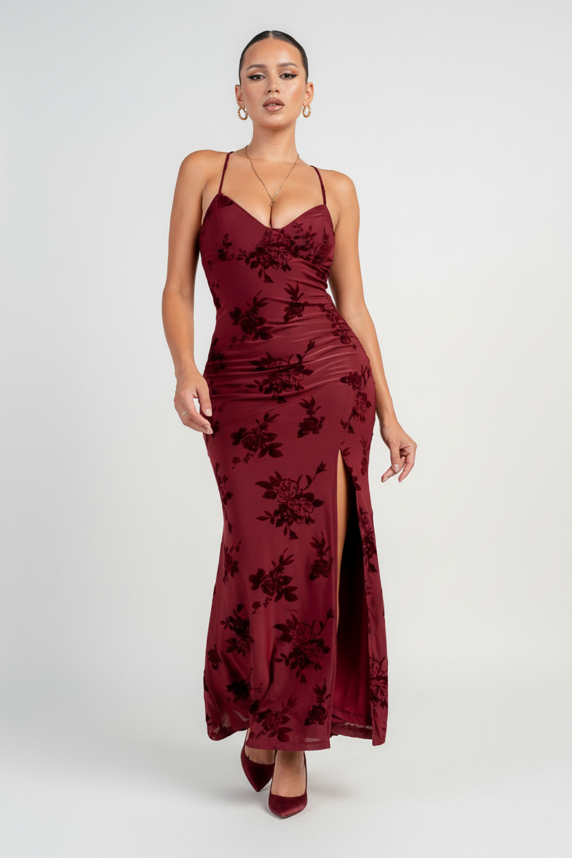 A deep burgundy floral velvet gown with spaghetti straps, crisscross open back, bodycon fit, and a high front slit.