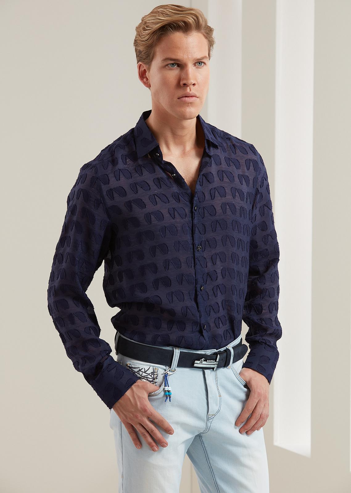 A luxurious button-down shirt featuring a hand-placed rhinestone Baroque design. Its lightweight material ensures a slim fit with long-sleeves, and the classic sea creature print design makes it a unique and stylish choice.